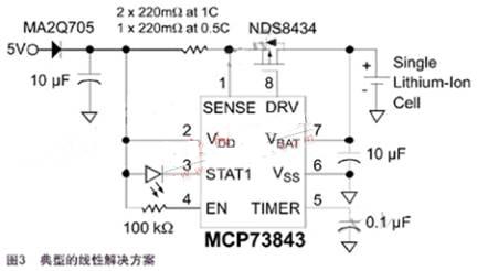 例如,應(yīng)用中需要利用一個(gè)5V ±5%的輸入電源以0.5C或1C的恒定電流對(duì)一個(gè)1000mAh的單節(jié)鋰離子電池充電。圖3顯示了如何利用Microchip的 MCP73843構(gòu)成一個(gè)低成本的獨(dú)立解決方案,只需要極少量的外部元器件,就可以實(shí)現(xiàn)所需要的充電算法。MCP73843完美地結(jié)合了高精度恒流充電、 恒壓穩(wěn)壓以及自動(dòng)充電終止等功能。
