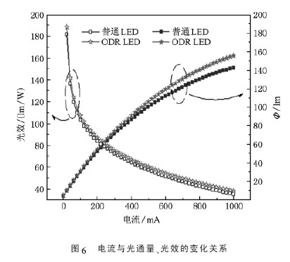 對(duì)兩種LED 的光通量和光效隨電流變化進(jìn)行測(cè)量,測(cè)量條件與I-V 特性測(cè)試相同. 結(jié)果如圖6 所示,從圖中明顯看出,兩種LED 的光通量隨著電流升高而逐漸升高,光效均隨著電流的升高而逐漸降低; 而ODR LED 的光通量和光效要始終高于普通LED,這從光通量和光效隨電流變化的角度來證實(shí)了ODR LED 的優(yōu)勢(shì).