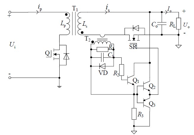 該驅(qū)動電路的基本工作原理:電流互感器T2 與次級同步整流管SR 串聯(lián)在同一支路,用來檢測SR 的電流。當(dāng)有電流流過SR 的體二極管,則在電流互感器的二次側(cè)感應(yīng)出電流,該電流通過R1 轉(zhuǎn)變成電壓,當(dāng)電壓值達(dá)到并超過晶體管Q1 的發(fā)射結(jié)正向電壓時,Q1 導(dǎo)通,達(dá)到二極管VD 導(dǎo)通電壓時,VD 導(dǎo)通對其箝位。晶體管Q1 導(dǎo)通后,輸出電壓通過圖騰柱輸出電路驅(qū)動SR 開通。當(dāng)SR 中的電流在電流互感器二次側(cè)電阻R1 上的采樣電壓降低到Q1 的導(dǎo)通閾值以下時,Q1 關(guān)斷,SR 關(guān)斷。