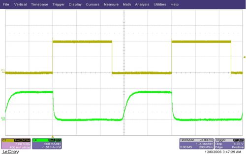 透過軟啟動電容器 C5 的短路快速地開/關(guān)轉(zhuǎn)換器,是調(diào)節(jié) LED 亮度一種簡單的方法。圖 2 顯示了 PWM 輸入訊號和實際的 LED 電流。這種 PWM 亮度調(diào)節(jié)方法較為有效,因為轉(zhuǎn)換器關(guān)閉并且在 SS 接腳短路時僅消耗極少的功率。但是這種方法也相對較慢,因為轉(zhuǎn)換器每次開啟時都必須以一種可控制方式逐漸升高輸出電流,進而在輸出電流上升以前產(chǎn)生一個非線性、有限的停滯時間 (dead-time)。同時,這也將開啟時間的最小負載周期降低至 10%-20%。在一些不要求高速和 100% PWM 調(diào)節(jié)的 LED 應(yīng)用中,這種方法或許就已足夠。