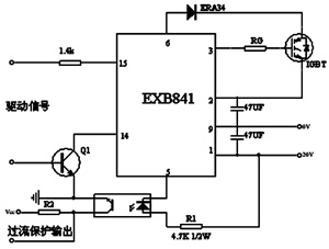 隨著IGBT在各類變流裝置中的廣泛應(yīng)用,IGBT驅(qū)動模塊的選擇及其性能越來越引起使用者的重視。理想的驅(qū)動模塊除了應(yīng)為IGBT提供足夠的開通和關(guān)斷柵壓外,還應(yīng)具備迅速、可靠的保護功能,同時力求電路簡單、穩(wěn)定。IGBT的常用驅(qū)動模塊有許多種,其中EXB系列應(yīng)用最廣。EXB841驅(qū)動模塊廣泛應(yīng)用于開關(guān)電源、UPS、電力傳動及電力補償?shù)阮I(lǐng)域。圖4所示是本設(shè)的IGBT的驅(qū)動電路圖。