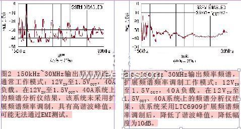 同樣的設計設置將用作采用LTC6909時的基準。4相并聯(lián)的μModule系統(tǒng),在40A時以12V輸入、1.5V輸出運行,同時它可正常工作的最大電流高達48A。多相同步可降低一些EMI,但可能還不足以滿足嚴格的EMI規(guī)范要求。用一個頻譜分析儀來檢查當前系統(tǒng)的頻率諧波。觀察到的基頻和諧波范圍為150kHz~30MHz。分辨帶寬是9kHz。結果如圖2所示。對單個諧波頻率的觀察表明當前系統(tǒng)具體的輸出值。視具體的EMI要求的不同,這些諧波尖峰可能超過規(guī)范要求,無法取得合格證書。