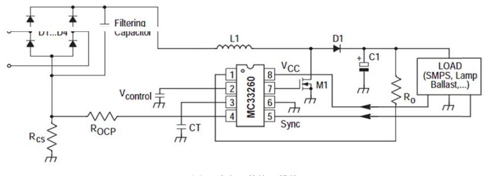 選用小功率功率因數(shù)校正芯片MC33260,它工作在電流臨界模式。MC33260應(yīng)用簡(jiǎn)單可靠。通過電流檢測(cè)和電壓反饋,通過PI調(diào)節(jié)來保持電壓恒定。通過對(duì)開關(guān)管的PWM控制來得到所需要電壓。可實(shí)現(xiàn)0.998的功率因數(shù)校正和輸出穩(wěn)定直流電壓的功能。