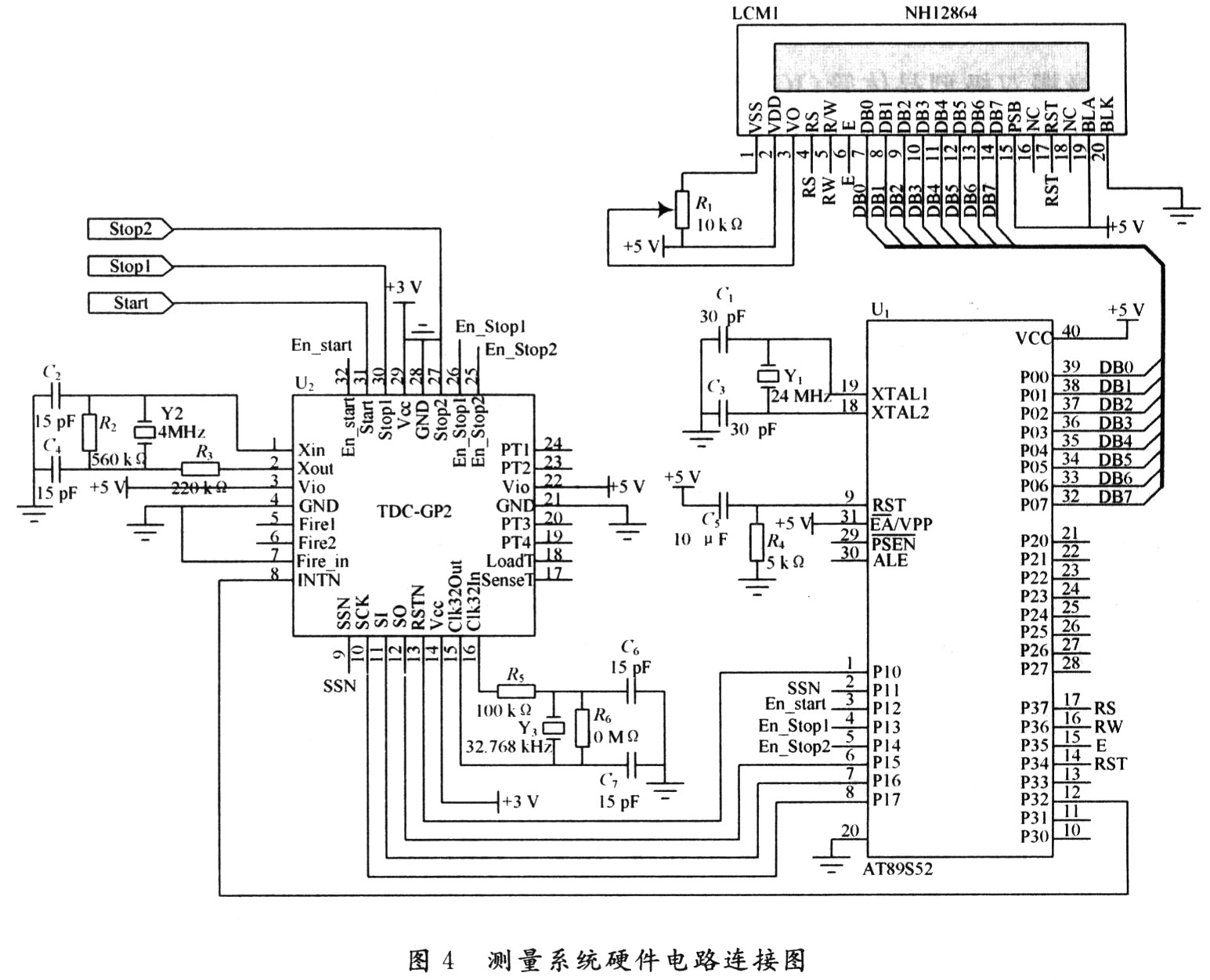 系統(tǒng)主要由脈沖信號取樣器、脈沖輸入信號整形電路、TDC-GP2測量電路、AT89S52單片機(jī)、液晶顯示電路、電源電路、時鐘電路組成。TDC-GP2的每個測量通道都提供一個使能引腳,可獨(dú)立地設(shè)置這兩個引腳進(jìn)行通道選擇。TDC-GP2需要一個2~8 MHz的高速時鐘進(jìn)行校準(zhǔn)用。TDC-GP2只是在進(jìn)行時間測量時才必須用振蕩器,且能夠自動控制振蕩器的開啟時間。整個系統(tǒng)的硬件電路連接如圖4所示。
