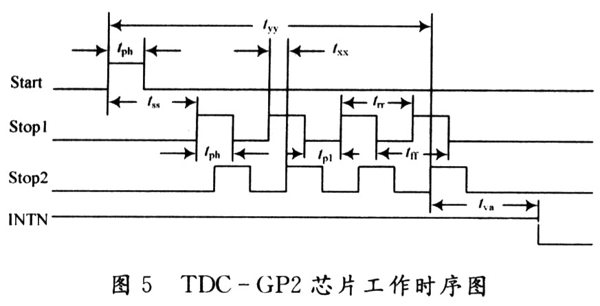 在時間測量芯片TDC-GP2的測量范圍1中,兩個STOP通道共用一個START通道。每個通道的典型分辨率為50 ps,每個STOP通道都可以進(jìn)行4次采樣。具有15 ns間隔脈沖對的分辨能力,測量范圍為2.0~1.8μs,每個通道都可以選擇上升沿或下降沿觸發(fā)。ENABLE引腳提供強(qiáng)大的停止信號產(chǎn)生的功能,可測量任意兩個信號之間的時間間隔。