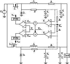 式中:Vc1、Vc2分別為C1和C2上電壓的平均值;IL1、IL2分別是L-和L2流過電流的平均值,亦即兩路輸出電流平均值;R1及R2是濾波電感的等效串聯(lián)電阻,當在工藝上設計并聯(lián)電源每路輸出電感基本上一樣時,可以認為R1=R2。因此,要控制兩路電流均流,即要求IL1=IL2,于是,只要控制Vc1=Vc2就行了。所以,電容C1及C2上的電壓Vc1和Vc2可以代表兩路電流IL1及IL2大小,可用來進行均流控制。