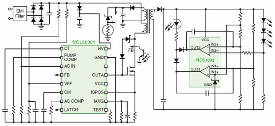 NCL30001是一種單段拓?fù)浣Y(jié)構(gòu)LED驅(qū)動方案,其靈活的特性非常適合應(yīng)用于新的LED照明產(chǎn)品,其他規(guī)格特性還包括高壓啟動電路、電壓前饋以改善環(huán)路響應(yīng)、輸入欠壓檢測、內(nèi)部過載定時器、閂鎖輸入,以及減少輸入線路諧波的高精度乘法器。這種方案采用連續(xù)導(dǎo)電模式(CCM)工作,集成了PFC和隔離型DC-DC轉(zhuǎn)換電路,并提供恒定電流來直接驅(qū)動LED,相當(dāng)于將AC-DC轉(zhuǎn)換與LED驅(qū)動兩部分電路整合在一起,均位于照明燈具內(nèi),省去了LED光條中集成的線性或DC-DC轉(zhuǎn)換器。這種整體式方案的電源轉(zhuǎn)換段更少,減少元器件使用數(shù)量(如光學(xué)元件、LED、電子元件及印制電路板等),降低系統(tǒng)成本,并支持更高的LED電源總體能效。當(dāng)然,這種方案的功率密度更高,可能并不適合所有區(qū)域照明應(yīng)用,其光學(xué)圖案可能更適合較低功率的LED,典型應(yīng)用包括LED街燈、外墻燈、洗墻燈及電冰箱箱體照明等。
