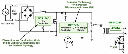 LLC拓?fù)浣Y(jié)構(gòu)采用串聯(lián)類型的諧振轉(zhuǎn)換器,能在相對寬的輸入電壓和輸出負(fù)載范圍下工作。此外,由于諧振儲能元件可以部分或完全集成在主變壓器中,LLC拓?fù)浣Y(jié)構(gòu)只需要數(shù)量有限的元器件。再加上在所有負(fù)載條件下,LLC拓?fù)浣Y(jié)構(gòu)的初級開關(guān)都能工作在零電壓開關(guān)條件,次級整流器都能工作在零電流開關(guān)條件。所以,LLC拓?fù)浣Y(jié)構(gòu)是高性價比、高能效及優(yōu)化了電磁干擾的解決方案。