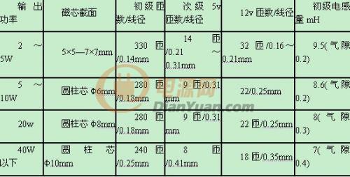 制作RCC型電源關(guān)鍵是脈沖變壓器T的繞制。無論何種開關(guān)電源脈沖變壓器的計算是極繁瑣又極不準(zhǔn)確的,對業(yè)余制作者來說通過估算,實驗調(diào)整來確定比較實際。即使是估算也涉及磁芯材料,結(jié)構(gòu)的影響,限于目前市場產(chǎn)品參數(shù)的離散性,業(yè)余者也難以確定,此處只列出部分計算結(jié)果供參考。小功率開關(guān)電源脈沖變壓器制作參數(shù)(繞組功能參考附圖)如附表所示。