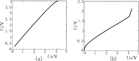 根據(jù)所設(shè)計的檢測電路進行實驗,實驗時,調(diào)節(jié)輸入電壓Ui的大小,并檢測與之對應(yīng)的輸出電壓UO的大小,實驗結(jié)果如表1(a)所示。為了進行對比,同時測出沒有反饋的光耦的輸入與輸出電壓關(guān)系,并列在表1(b)。根據(jù)表1中(a)、(b)的數(shù)據(jù)分別繪出檢測電路與單個光耦的傳輸特性,分別如圖3(a)、(b)所示。