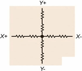 在最簡單的四線(Four-wire)電阻式連接中,頂層兩端和低層兩端分別各連接兩個(gè)電極,兩層的電極互相呈九十度交叉,形成四線星狀連接結(jié)構(gòu),這實(shí)際上就是一對彼此正交的電位計(jì)(圖2),相當(dāng)于機(jī)械操縱桿的平面屏幕模擬。為了在X軸方向測量觸摸位置,觸控板的控制器將X-設(shè)為接地,而X+偏置為參考電壓,然后從Y層的兩端讀取電壓,以找出X軸上兩層的接觸點(diǎn)。同樣地,控制器透過在Y層的電極上加載驅(qū)動電壓,并從X層讀取觸摸點(diǎn)電壓,可以確定Y軸上的觸摸位置。