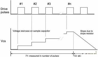 脈沖串產(chǎn)生的第一個(gè)斜坡是加到采樣電容上的梯級波形訊號,脈沖串過后,驅(qū)動器把斜率電阻的參考端切換為高電平,對采樣電容進(jìn)行放電,直到將電荷用完,電壓比較器檢測出零交叉點(diǎn)為止,獲得零交叉點(diǎn)所需的斜坡時(shí)間與X、Y電荷耦合成比例,并隨用戶手指觸摸面板表面而減?。▓D5)。