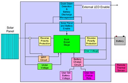設(shè)計(jì)工作包括根據(jù)功率需求的增加隔離拓?fù)浣Y(jié)構(gòu)。電池充電狀態(tài)的管理是由適當(dāng)?shù)某潆娝惴ㄍ瓿傻?。太?yáng)能電池板安裝技師可以選擇輸出電壓和電池充電速率。由于控制器要連接到太陽(yáng)能電池板,它必須具有最大功率點(diǎn)跟蹤,為最終客戶提供高價(jià)值??刂破饔袃蓚€(gè)正使能(Enable)電路,一個(gè)電路檢測(cè)黑夜時(shí)間,另一個(gè)檢測(cè)電池的充電狀態(tài),使外部電路不會(huì)使電池對(duì)損壞點(diǎn)放電。由于控制器將由不同程度經(jīng)驗(yàn)的現(xiàn)場(chǎng)技術(shù)人員和新手安裝,因此重要的是輸入和輸出必須有反向極性保護(hù)。另外,控制器和電池可能安裝在過熱或過冷的位置,控制器必須采用電池充電溫度補(bǔ)償。設(shè)計(jì)還應(yīng)包括安全功能,如電池過壓檢測(cè)和太陽(yáng)能電池板欠壓檢測(cè)。