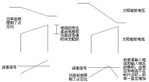 為了從功率可變的電源(即太陽(yáng)能電池板)析取出最大的功率,太陽(yáng)能控制器必須采用MPPT。MPPT必須首先找到最大功率點(diǎn)并及時(shí)調(diào)整環(huán)境條件,以保持控制器接近最大功率點(diǎn)。動(dòng)態(tài)MPPT用在系統(tǒng)發(fā)生改變的情況下。由于每個(gè)開關(guān)周期都在發(fā)生變化,太陽(yáng)能電池板汲取的功率也會(huì)在每個(gè)周期有明顯的改變。動(dòng)態(tài)MPPT利用太陽(yáng)能電池板的電壓驟降乘以每個(gè)開關(guān)周期增加的電流,以確定將要產(chǎn)生的誤差信號(hào)來(lái)調(diào)節(jié)占空比。動(dòng)態(tài)響應(yīng)可檢測(cè)IV曲線的斜率,從而建立一個(gè)功率斜坡,從誤差信號(hào)相交點(diǎn)建立一個(gè)代表占空比的功率。當(dāng)斜坡變化斜率從正到負(fù)時(shí)該周期結(jié)束,如圖2所示。