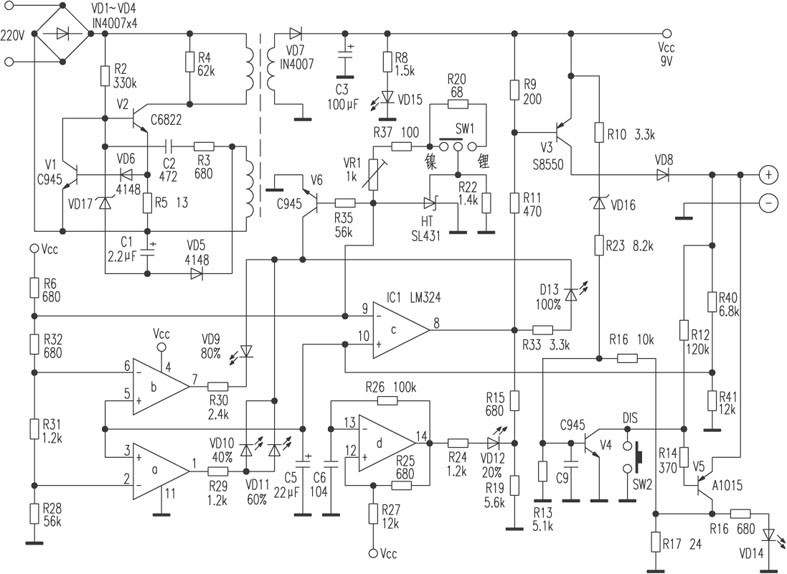 如果是為鎳鎘、鎳氫電池充電,由于這類電池存在一定的記憶效應,需不定時對其進行放電。SW1是鎳鎘、鎳氫、鋰離子電池充電轉換開關。SW1與精密基準電源SL431為運放LM324 ⑨提供兩個不同的精密基準源,由SW1切換。在給鎳鎘、鎳氫電池充電時,LM324 ⑨腳的基準電壓約0.09V(空載);在給鋰離子電池充電時,LM324 ⑨腳的基準電壓約為0.08V(空載),這種設計是由這兩種類型電池特有的化學特性決定的。按下SW2,V5基極瞬間得一低電平而導通,可充電池上的殘余電壓通過V5的e c極在R17上放電,同時放電指示燈VD14點亮。在按下SW2后會隨即釋放,這時可充電池上的殘余電壓通過R16、R13分壓,C9濾波后為V4的基極提供一個高電平,V4導通,這相當于短接SW2。隨著放電時間的延長,可充電池上的殘余電壓也越來越低,當V4基極上的電壓不能維持其繼續(xù)導通時,V4截止,放電終止,充電器隨即轉入充電狀態(tài)。