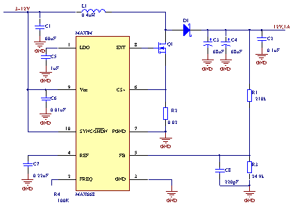 我們采用MAXIM公司的升壓型dc/dc芯片MAX668。MAX668具有很寬的輸入輸出電壓范圍,它可以將3~12V的輸入電壓升高到12V輸出,同時(shí),由于其采用了低至100mV的電流檢測(cè)電壓和MAXIM公司特有的空閑模式,轉(zhuǎn)換效率高達(dá)90%以上,具有最高1A的電流輸出能力,升壓電路如圖6所示。
