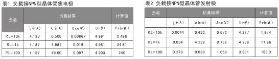 為了說明晶體管負(fù)載的不同接法對驅(qū)動電路的影響,我們借助Multisim 10 仿真軟件分析負(fù)載電阻為100、1k、10k 情況下圖3(a)、(b)中電路的各個參數(shù),得到的仿真結(jié)果如表1 和表2 所示。