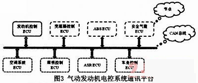 氣動發(fā)動機的控制系統(tǒng)是極其復雜的,不僅包括轉速、油門位置等信號的采集處理;還要對電磁閥的噴氣定時和噴氣量完成精確控制等等。另外,氣動汽車上還包括ABS、空調系統(tǒng)和車輛燈光等模塊,這些模塊需要實時共享車輛的數(shù)據(jù),以達到整車的最優(yōu)控制。傳統(tǒng)的電氣控制設計策略已經(jīng)不能滿足當今電氣控制網(wǎng)絡的需要,而CAN總線的數(shù)據(jù)通訊具有突出的可靠性、實用性和靈活性等特點。氣動發(fā)動機電控系統(tǒng)通訊平臺如圖3所示。它具有布線成本低、通訊速率高和數(shù)據(jù)傳輸精度高等優(yōu)勢。