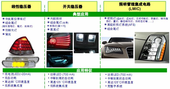 汽車的前照燈包括不同細分領(lǐng)域,如日間行車燈(DRL)、近光及遠光燈、信號燈和霧燈等。前照燈中最早應(yīng)用LED的是日前行車燈。而隨著高亮度LED的成本持續(xù)降低及性能持續(xù)提升,越來越多的新車設(shè)計正更廣泛地將LED用于其它前照燈領(lǐng)域,如近光及遠光燈、信號燈及霧燈等,甚至利用LED提供光束整形、路面聚光(motorway spot)等新興功能。
