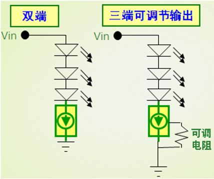 適合低電流LED應(yīng)用的CCR,可以采用安森美半導(dǎo)體運用專利自偏置晶體管(SBT)技術(shù)開發(fā)出來得NSI45系列。這系列CCR包含雙端固定輸出和三端可調(diào)節(jié)輸出兩種類型,電流等級涵蓋10至180 mA,雙端及三端CCR電路圖如圖2所示。其中三端可調(diào)節(jié)輸出CCR包括電流30至80 mA(SOT-223)及60至150 mA(DPAK)等不同選擇,能夠用于滿足特定電流設(shè)置要求。