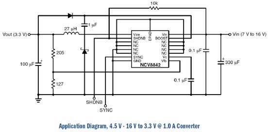 在降壓開關(guān)驅(qū)動器方面,包括NCV8842、NCV8843及NCV51411等產(chǎn)品,適合于車身/遠程信息系統(tǒng)等應(yīng)用。NCV8842/3是帶同步功能的1.5 A、170/340 kHz降壓驅(qū)動器,支持4.5 V至40 V輸入電壓,而輸出電壓可從1.27 V開始編程設(shè)定。同步引腳功能用于改善EMI性能。