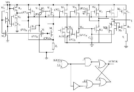 SE 為輔助振蕩器切換信號, SEB 為SE 的反信號。當(dāng)V DD低于1. 9 V 時, SE 為高電平, M17 , M18 都截止, 不影響R, S 觸發(fā)器的翻轉(zhuǎn), 輔助振蕩器工作, 開關(guān)S1 斷開, S2 閉合; 當(dāng)VDD 高于1. 9 V 時, SE 為低電平, 輔助振蕩器關(guān)斷, 開關(guān)S1 閉合, S2 斷開, M17 , M18 都導(dǎo)通, R=1, S= 0, AU XCLK 被鎖定為高電平, 既減小了功耗, 也避免了輔助振蕩器關(guān)斷之后R, S 端出現(xiàn)不確定狀態(tài)。