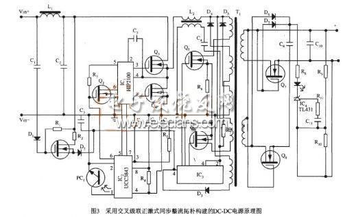 圖 3所 示 為采用交叉級(jí)聯(lián)正激變換電路設(shè)計(jì)的通信設(shè)備專用DC-DC半磚電源原理圖。工作原理如下,R,, R2. D,, Q,, D:和C:組成自舉啟動(dòng)電路,得到啟動(dòng)電壓Vc分別給ICI,I C2和IC3供電。電路啟動(dòng)后,T,的輔助繞組經(jīng)D3整流,C3平滑濾波后為IC提供電壓VD,因VD電壓高于Vc,二極管D2反偏,Q、的供電關(guān)閉,達(dá)到啟動(dòng)電路無(wú)功耗的目的。IC:的腳6輸出方波信號(hào),一路直接送到ICl的腳5,另一路經(jīng)Q2倒相后送到IC:的腳6作為IC,的輸入信號(hào)。IC,的腳3和腳8輸出相位相差180“的方波脈沖信號(hào),分別驅(qū)動(dòng)MOSFETQ 31 Q 4- Q3" Q 4" L 2等組成高效率的同步降壓級(jí),降壓級(jí)的占空比保持在30-60%. IC3.Qs"Q6"T.等組成交叉級(jí)聯(lián)正激式隔離級(jí),達(dá)到DC-DC最終的輸出電壓。馬、DS為變壓器T,的磁復(fù)位繞組。由于降壓級(jí)已將變化范圍較寬的輸入電壓嚴(yán)密調(diào)整為中間總線電壓,因此隔離級(jí)不需調(diào)壓。交叉級(jí)聯(lián)正激變換器都工作在50%的占空比,可以采用VDS為100V的MOSFET. Q7, Q:等組成自偏置式同步整流電路,因隔離級(jí)的輸出電壓是固定的,所以同步整流MOSFET漏極的輸入電壓也是固定的,占空比也為50%,可以使用VDS很低的MOSFET(本例中采用的是VDS為12V的MOSFET,損耗最低)因功耗引起的發(fā)熱問(wèn)題均可以方便解決。因輸入電壓固定,多出電壓時(shí),能夠方便地實(shí)現(xiàn)高電壓調(diào)整率和高負(fù)載調(diào)整率,單級(jí)變換器很難做到此點(diǎn)。其他電路功能(如過(guò)流、過(guò)壓、過(guò)溫度保護(hù)等)不再一一闡述。經(jīng)測(cè)量該電路的工作效率約在92%左右,達(dá)到預(yù)定的設(shè)計(jì)要求,并且調(diào)試較簡(jiǎn)單,為今后的批量生產(chǎn)奠定了基礎(chǔ)。
