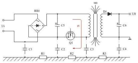 值得一提的是,開關(guān)電源變壓器初級線圈的漏感產(chǎn)生的反電動勢et,在所有干擾信號之中是最不容忽視的,如圖3所示。當(dāng)電源開關(guān)管關(guān)斷的時候,開關(guān)電源變壓器初級線圈的漏感產(chǎn)生的反電動勢et幾乎沒有回路可釋放,一方面,它只能通過初級線圈的分布電容進行充電,并讓初級線圈的分布電容與漏感產(chǎn)生并聯(lián)諧振;另一方面,它只能通過輻射向外進行釋放,其中通過對地電容C3與大地相連,也是反電動勢et釋放能量的一個回路,因此,它對輸入端也會產(chǎn)生共模信號干擾。