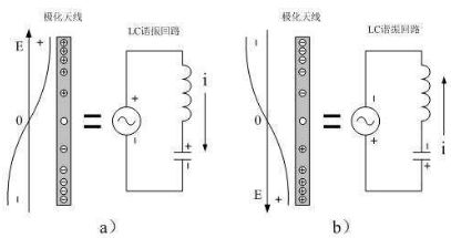 天線來回極化的工作原理可以等效成一個串聯(lián)諧振電路,當(dāng)天線在電場力的作用下被極化帶電時,它又相當(dāng)于一個電容在充電;當(dāng)天線中的載流子在電場力的作用下來回移動時,它又相當(dāng)于一個電感,并且在天線的周圍會產(chǎn)生磁場。
