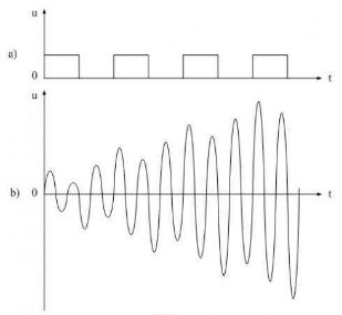 圖6是諧振回路產(chǎn)生諧振的工作原理圖。圖6-a)是一個含有諧波分量非常豐富的電壓方波,圖6-b)是LC串聯(lián)回路產(chǎn)生諧振時的電壓波形。當(dāng)電壓方波作用于LC串聯(lián)回路時,方波的前后沿都會對LC串聯(lián)回路產(chǎn)生激勵(即接收能量),每次激勵過后又會產(chǎn)生阻尼振蕩(即損耗能量),當(dāng)輸入電壓波形的上升率dv/dt值大于諧振回路波形(正弦波)的上升率時,電路就會產(chǎn)生激勵;當(dāng)輸入電壓波形的上升率dv/dt值小于諧振回路波形的上升率時,電路就會產(chǎn)生阻尼。