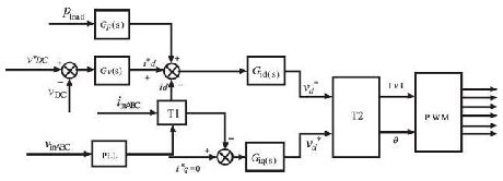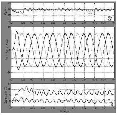 在正常工作條件下, 穩(wěn)壓器輸出穩(wěn)定的直流母線電壓和d 軸電流控制, 但是逆變器負(fù)荷不均衡, 就會產(chǎn)生波動的直流電壓, 因此整流器在不平衡負(fù)載下會造成前端總諧波失真( THD) 的輸入電流。