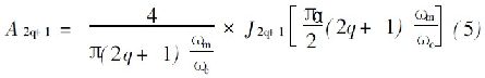 式中, q= 0, 1, 2, ……∝;ω m 是調(diào)制頻率; ωc 是載波頻率; ωm ≤ωc , a是調(diào)制指數(shù); J v ( z) 是第一類Bessel 函數(shù)。公式( 5) 只適用于頻率范圍遠(yuǎn)遠(yuǎn)低于載波頻率, 此時在一次波段的載波頻率可以忽略不計。在本文的系統(tǒng)研究中, m / c= 1/ 90 適用于規(guī)定計算, 并假設(shè)調(diào)制指數(shù):