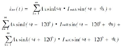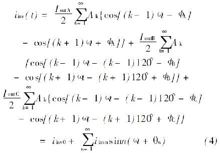式中, I inv0是直流分量的逆變器輸入電流; I invn 是n 階部分的電流。通過公式( 4) 可看到, I outA = I outB = I outC和ΦA= ΦB= ΦC , 同時有I invn = 0, 如果n> 0 三相負(fù)載電流是平衡的。否則, 交流成分存在會造成連鎖反應(yīng)。