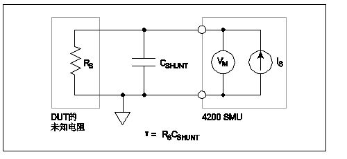 測(cè)量電路的建立時(shí)間在測(cè)量小電流和高電阻時(shí)尤其重要。建立時(shí)間是指施加或改變電流或電壓后測(cè)量達(dá)到穩(wěn)定的時(shí)間。影響測(cè)量電路建立時(shí)間的因素包括并聯(lián)電容(CSHUNT)和源電阻(RS)。并聯(lián)電容是由于連接電纜、測(cè)試夾具、開關(guān)和探針造成的。DUT的源電阻越高,建立時(shí)間越長(zhǎng)。圖6的測(cè)量電路中標(biāo)出了并聯(lián)電容和源電阻。