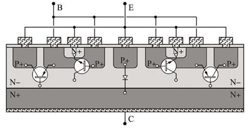 采用鉗位型開關(guān)晶體管也能降低開關(guān)晶體管的關(guān)斷延時(shí), 其原理是通過鉗位電路使VBC在晶體管導(dǎo)通時(shí)不能增加到深飽和所需的0. 7 V, 這樣注入集電結(jié)兩側(cè)的少子很少, 使超量儲(chǔ)存電荷很少, 這樣儲(chǔ)存時(shí)間大大縮短。采用鉗位型開關(guān)晶體管主要有兩種, 一種是在集電結(jié)并聯(lián)肖特基二極管的晶體管,由于在高溫下漏電電流較大, 其ts - Vcesat的Trade??o ff關(guān)系最差, 目前應(yīng)用較少。另一種是橫向PNP鉗位型晶體管, 其結(jié)構(gòu)圖如圖6所示, 它在高溫下漏電較小, 能得到較好的Trade-off關(guān)系,電流放大系數(shù)基本不變, 目前得到了越來越多的應(yīng)用, 如吉林華微電子股份有限公司研發(fā)的產(chǎn)品3DD13003A 就采用了這種結(jié)構(gòu)。