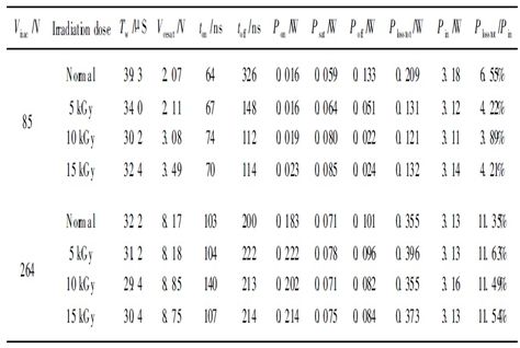 從圖3 中可以看到, 在較低的交流輸入電壓(如85 V和115 V )下, 使用輻照后的APT13003E比使用未輻照的APT13003E 系統(tǒng)效率都有所提高, 而在較高交流輸入電壓下(如230 V 和264 V ), 輻照后的APT13003E 未能使系統(tǒng)效率提高。在85 V 交流輸入電壓下, 輻照劑量為10 kGy 的APT13003E的性能最好, 開關(guān)晶體管的總損耗由0. 209W 降低到0. 121W, 降低了42% , 使得系統(tǒng)整體效率提高了2. 1% , 若該開關(guān)晶體管采用TO - 92封裝, 這將使開關(guān)晶體管的結(jié)溫降低約11 ℃ ; 在115 V交流電壓下, 系統(tǒng)的整體效率也提高了約1. 4%, 開關(guān)晶體管的結(jié)溫將降低約7℃, 這就有效地提高開關(guān)晶體管的可靠性, 降低了開關(guān)電源的損耗。