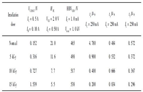 從表1中我們可以看到, 經(jīng)過輻照后, 儲(chǔ)存時(shí)間ts 隨著輻照劑量的增大有很大幅度的減小, 下降時(shí)間tf 有所減小, 上升時(shí)間tr 有所增加; 電流放大系數(shù)隨著輻照劑量的增加而下降; 飽和壓降和擊穿電壓HBVceo隨輻照劑量的增大而增大。