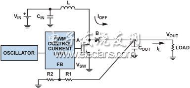 使用肖特基二極管代替開關(guān)B的調(diào)節(jié)器定義為異步 (或非同步), 調(diào)節(jié)器,而使用FET作為開關(guān)B的調(diào)節(jié)器定義為同步調(diào)節(jié)器。圖3中,開關(guān)A和B已分別使用內(nèi)部NFET和外部肖特基二極管來實(shí)施,從而形成異步升壓調(diào)節(jié)器。對于需要負(fù)載隔離和低關(guān)斷電流的低功耗應(yīng)用,可添加外部FET,如圖4所示。將器件的EN引腳驅(qū)動至0.3 V以下便可關(guān)斷調(diào)節(jié)器,使輸入與輸出完全斷開。