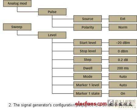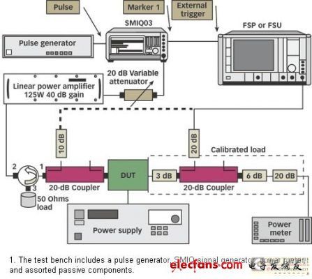 測試臺(圖1)使用一個與SMIQ RF信號發(fā)生器“脈沖”輸入相連接的脈沖發(fā)生器。為了在功率掃描模式中使用SMIQ,功率掃描必須與信號分析器中的時基掃描同步。幸好,當(dāng)與二極管檢測器和類似XY模式濾波鏡的顯示器相關(guān)聯(lián)時,這一類信號發(fā)生器具有可以被用作純量網(wǎng)絡(luò)分析儀(SNA)的特性。在SMIQ的后部面板上,有幾個帶有功率掃描斜線以驅(qū)動濾波鏡的X軸的BNC連接器,以及校準(zhǔn)顯示器X軸的標(biāo)記。既然這樣,“標(biāo)記”的輸出被當(dāng)作信號分析器的觸發(fā)信號來使用。
