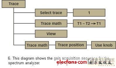 用于頻譜分析器的功能序列顯示在圖6中。線跡1設(shè)定為計(jì)算“線跡1”減去“線跡2”,后者包含了輸入功率。這樣,新獲取的輸出功率將提供一個以dB為單位的增益圖。“線跡位置”特征被用作獲得直接讀取以dB為單位的絕對增益的一個偏差。線跡偏差被設(shè)置為“輸出偏差”減去“輸入偏差”。這種情況下,“輸入偏差”在校準(zhǔn)階段被確定為30.7dB,結(jié)果得到偏差值為13dB。該值不能直接作為以dBm為單位的偏差值加入,因?yàn)?ldquo;線跡位置”清單只接受作為Y刻度百分比的輸入。旋轉(zhuǎn)鈕用來獲取與13dB偏差值相對應(yīng)的正確百分比。圖7中的藍(lán)線即為所得。
