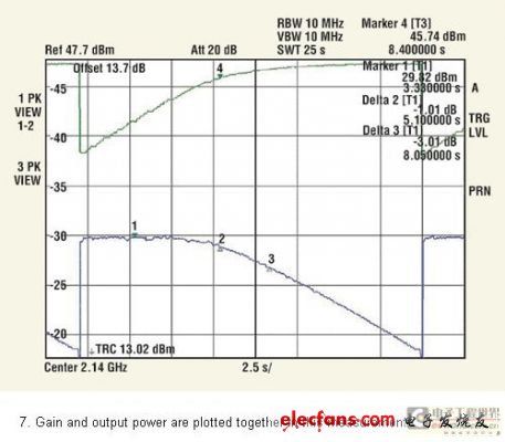 用于頻譜分析器的功能序列顯示在圖4中。此刻,頻譜分析器連接到輸入,且輸入功率在第二條線跡(線跡2)獲取,并保持在“觀察”模式。圖5中的黑色線跡即得。當(dāng)在輸出再連接分析器之后,從第三條線跡(線跡3)獲得輸出功率,同樣也保持在“觀察”模式。通過設(shè)置“輸出偏差”值的參數(shù)等級偏差,該值在校準(zhǔn)階段被設(shè)為43.7dB,從“線跡3”可以直接讀取以dBm為單位的絕對輸出功率,圖5中的綠線即得。通過在鋸齒末端的平面區(qū)域安置標(biāo)記,可以讀取如圖5 中綠線所示的飽和功率。MW4IC2230MB顯示+47.23dBm的飽和功率。
