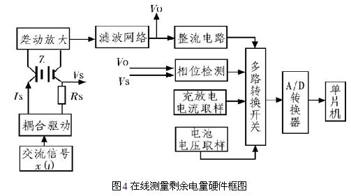 給電池施加一個(gè)固定頻率和固定電流(日前一般使用l kHz頻率、50 mA小電沆),然后對(duì)其電壓進(jìn)行采樣,經(jīng)過(guò)整流、濾波等一系列處理后通過(guò)運(yùn)放電路計(jì)算出該電池的內(nèi)阻值。圖4為在線測(cè)量剩余電量硬件框圖。