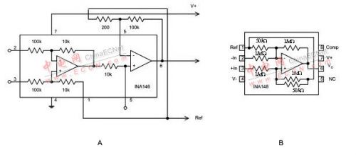 老式分路檢測電路基于差動放大器,即周圍帶四個電阻來設(shè)置增益并提供差動輸入的運算放大器 (operation amplifier)。這些電阻使運算放大器能接受超過其電源軌的共模電壓。不過,這也會帶來下面一些負(fù)面問題:一是電路必須配置為衰減器,在隨后的運算放大器級中恢復(fù)增益,如圖 2A 中的 IC 結(jié)構(gòu)圖所示,運算放大器的增益會成倍增大第一個放大器的偏置和漂移量,從而降低整體性能。二是采用高共模電壓差動放大器要增加電阻網(wǎng)絡(luò),以使之在仍然只提供單位增益的同時能夠接受較高的共模電壓。高共模差動放大器帶來的影響在于:運算放大器的噪聲增益與共模衰減成正比,如圖 2B 所示的差動放大器結(jié)構(gòu)采用了 20:1 的內(nèi)部共模衰減,此舉使放大器的偏置、漂移和噪聲都比運算放大器本身擴(kuò)大了 20 倍。此外,較大的輸入電阻也會造成較高的噪聲。