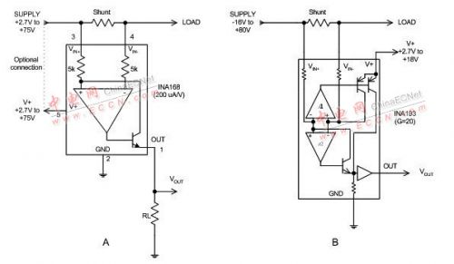 電流分路.是專門用于分路電流檢測的高共模電壓差動放大器,能夠解決電阻型差動放大器的局限性。電流分路.與差動放大器相比的主要區(qū)別在于:其共模電壓功能通常只擴(kuò)展到正電壓,而一些電流分路.允許共模接地。這會造成更多的衍生情況,我們隨后還要談到。共模電壓功能也允許擴(kuò)展到負(fù)電壓。電流分路.從一開始設(shè)計時就是以單電源電壓工作的,通常最低電壓可達(dá) 2.7V。圖 3 顯示了兩類電流分路.,分為電流輸出型分路.和電壓輸出型分路.。電流輸出型分路.通常靜態(tài)電流較低,需要外部輸出電阻,從而使終端用戶能夠設(shè)定增益。電壓輸出器件采用固定增益且不需要其他組件。