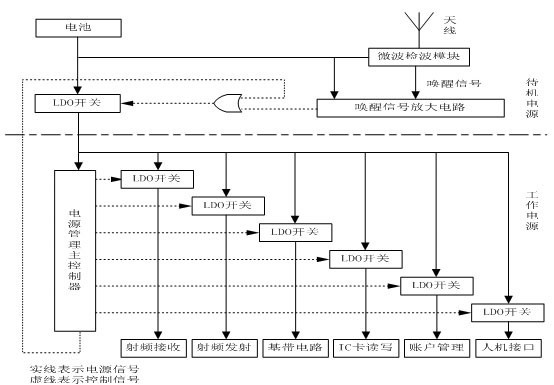 如OBU這種以嵌入式處理器為核心的系統(tǒng),其功耗主要由處理器功耗和外圍電路功耗組成??紤]實際的運行情況,汽車在公路上行駛的整個過程中,經(jīng)過收費站的時間是非常短的,OBU只需要在汽車經(jīng)過收費站時工作,而且工作時間不到一秒鐘,其他絕大部分時間都不需要工作。OBU智能電源管理采用電池供電的方法,控制OBU 工作在兩種模式,睡眠模式和激活模式;當(dāng)車進入收費站時,OBU被激活,開始工作,處于激活模式;當(dāng)交易完成,車離開收費站后,OBU馬上停止工作進入睡眠模式。根據(jù)這種特點,對電源采用分級管理的策略,即分為待機電源與工作電源,如圖2.1。