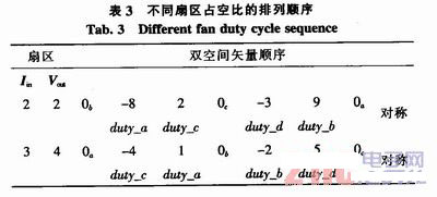 空間矢量調制法只確定開關間隔中應用電壓矢量的占空比,從而獲得低頻率的輸出電壓和輸入電流的平均值,但是并沒有確定使用的順序。所以需要使用雙空間矢量調制法,同時也可改善波形的質量。圖2表明了輸入電流在4扇區(qū),輸出電壓在5扇區(qū)應用雙空間矢量調制的順序。電壓矢量在開關間隔中對稱分布,零矢量每4個開關間隔使用一次。在每次開關轉換中只有一個開關狀態(tài)發(fā)生改變以最大程度地降低損耗。在圖2中通過表格2確定相應開關時間: