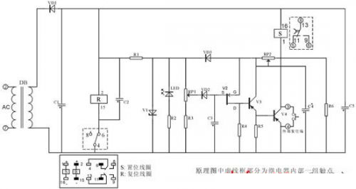 該電路核心部分由IC4541構成,延時設定由RP2、C*設定,A-B端根據(jù)需求接相應高、低電平(設定端)內部2繞組閉鎖繼電器采用DC12V(因繼電器工作電壓與IC4060組成延時電器要低,則為保證其驅動則分別由V6、V7、V1、V3構成)。其中C2為二次儲能器件,可根據(jù)延時的長短予以調整,C4為完成S置位線圈工作。
