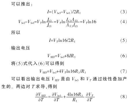 本文提出的電路核心結(jié)構(gòu)如圖1所示,在電路中雙極晶體管構(gòu)成了電路的核心,實現(xiàn)了VBE與VT的線性疊加,獲得近似為零溫度系數(shù)的輸出電壓。圖1中雙極型晶體管Q1和Q2的發(fā)射區(qū)面積相同,Q3和Q4的發(fā)射區(qū)面積相同,考慮設(shè)計需求,取Q1和Q2的發(fā)射區(qū)面積為Q3和Q4的發(fā)射區(qū)面積的8倍。