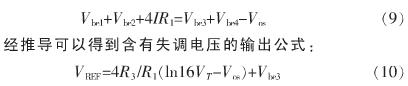 基準(zhǔn)源中運放的設(shè)計是非常重要的,運放的失調(diào)是基準(zhǔn)源的一個主要誤差源。由于不對稱性,運放會受到輸入失調(diào)的影響。假設(shè)失調(diào)電壓為Vos,經(jīng)計算得到含失調(diào)電壓的輸出公式為: