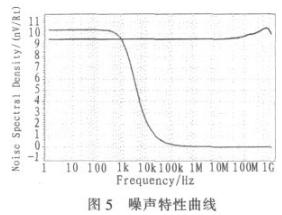噪聲是影響帶隙基準(zhǔn)源穩(wěn)定性的主要因素之一。通常噪聲分為外部噪聲和內(nèi)部噪聲。外部噪聲一般都由電源電壓的變化以及其他電路的干擾造成。內(nèi)部噪聲主要包括熱噪聲和閃爍噪聲。閃爍噪聲的大小與頻率成反比,因而在低頻下主要為閃爍噪聲,而高頻下為熱噪聲,對于高頻的熱噪聲,可以在輸出端Vref處加一個RC低通濾波器解決掉,而低頻的來自耦合到電源的噪聲則是需考慮的,可以通過提高電源抑制比來減小。圖5為電路在輸出端和電源電壓處的噪聲特性,在輸出端低頻時噪聲為10.4 nv/Rt,高頻時噪聲幾乎為0 nv/Rt,性能很好。電源電壓處的噪聲為9.6nv/Rt左右。